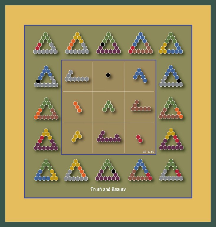 Some might say that the previous exhibit (page 19) is not really a geomagic square, because the target is non-existent. Nor will it help if the pieces are viewed as two dimensional, rather than as the 3-D objects they suggest. Scrutiny will show that piece outlines in targets often differ slightly from the outline of the same piece in its cell. Nevertheless, that a true geomagic square underlies the other is made evident here.