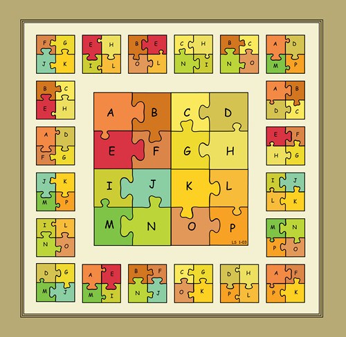 This magic jigsaw puzzle is an example of what I call a 'self-interlocking' geomagic square. The 16 pieces are no longer separated from each other within their cells, but interlock so as to pave a single square area. I had never imagined that such a structure was possible, until an examination of the geometrical analogues of certain algebraic magic squares forced their existence upon me. The visual harmony of the square is a reflection of the symmetries to be found in the algebraic magic square upon which it is based.