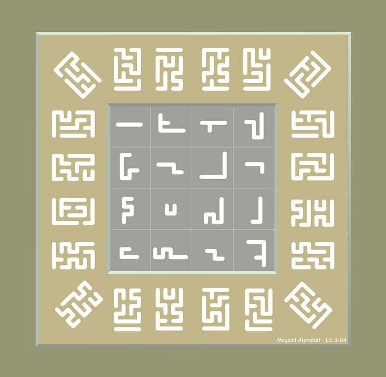 A 4×4 panmagic square using polyominoes, but so drawn as to suggest otherwise. White lines trace a path that connects the centres of each polyomino's unit squares. See how some pieces are necessarily forked, others not. The 4 pieces in each quadrant also tile the target. As a younger man, I have tried my hand at poetry. As an older man I turned to math, albeit at a humble level. Somewhat to my own surprise, I seem to have retraced my steps. At least, if this is not mathematical poetry, then I have never understood what poetry is.