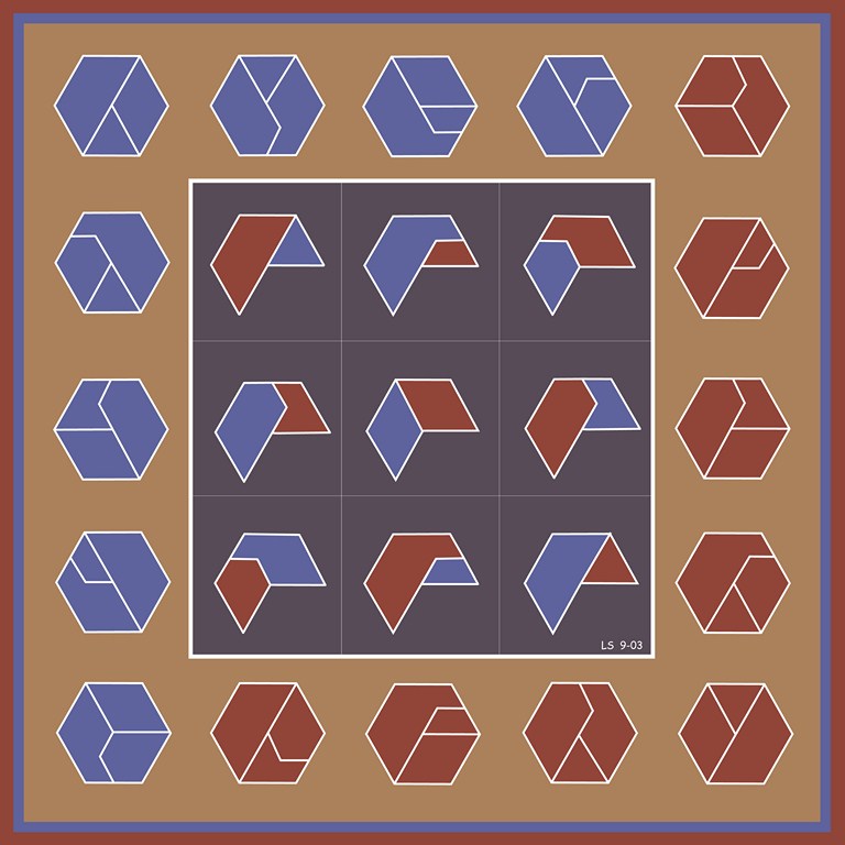 A square with hexagonal target, composed of complementary pairs of pieces occupying opposite positions about the centre. Each pair will combine to form the repeated chevron shape. Superimposing two copies of the same geomagic square, one red, one blue, but with one rotated by 180 degrees, yields a vivid demonstration of this property.